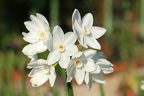 ニホンズイセンに先駆けて咲く房咲きスイセンの一種。副花冠が真っ白なのが特長。ヒガンバナ科の多年草。原産地は地中海沿岸。
