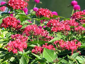 頂部に星形の小さな花をかたまって咲かせる。ペンタスの名はギリシャ語の5を意味することからきているようでそのつもりで見ると、花の各部が5個からできている。花色は桃・赤・紅・白・青紫などあるとのことだが、赤紫・ピンク・白を多く見かける。別名はクササンタンカ(草山丹花)という。多年草(半耐寒性)、アカネ科で原産地は、東アフリカ〜アラビアである。