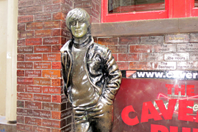 ビートルズがデビューするまでの活動の拠点だったキャヴァーン・クラブ(Cavern Club)があるマシュー・ストリート(Mathew Street)。彼らのマネージャーであるブライアン・エプスタインとの出会いもこの場所であった。通りにはジョン・レノンの彫像が立っている。