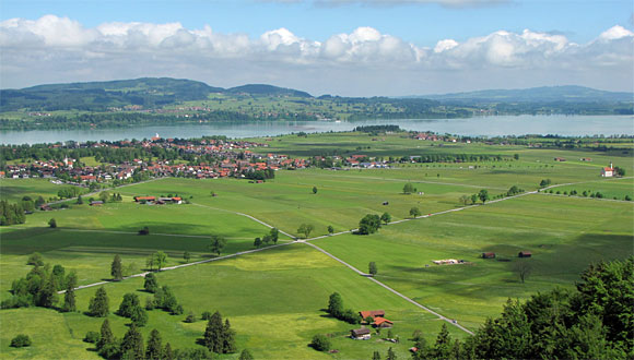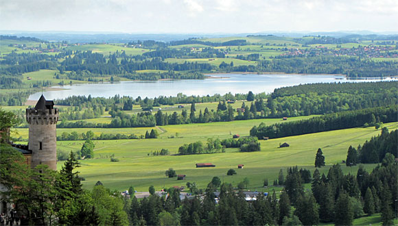 バイエルン国王ルートヴィヒ2世(1845〜1886)が17年もの歳月と巨費をかけて造った白亜の美しい城・ノイシュヴァンシュタイン城からの眺望。城内は撮影禁止になっているが、窓から外の景色は撮影できる。