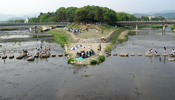 正式には「鴨川」であるが、高野川との合流点(下鴨神社近く)より上流を「賀茂川」と呼んでいる。最下段右の画像の中央に見えるのが、両河川の合流点である。突き出ている三角洲の右側の川が「高野川」、左側の川が賀茂川になる。三角州の奥の方に見える森が「糺の森」(ただすのもり)、その奥に下鴨神社がある。(今出川通の賀茂大橋上から撮影する。)