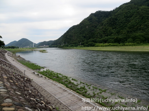 岐阜城から見た長良川である。長良川は鵜飼いでも知られ、橋のたもとに鵜飼い用の舟がつながれている。