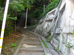 根岸町1丁目と2丁目の間をつづら折れに曲がりながら上る(降る)階段。坂と言うより、階段と言った方が正確です。地元の方も「七曲りの階段」と呼んでいた。