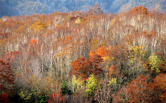 白糸の滝は、安達太良山の沼の平が源流になり、安達太良山中から湧き出る出る水(湯・温泉)が高さ約150mの絶壁を伝わって流れ落ちている。沼尻スキー場の上、安達太良山の登山口から登ったところに展望台がある。そこからの眺望である。眼下に広がる山々や滝を見ていると大自然の偉大さを感じ取ることが出来る。