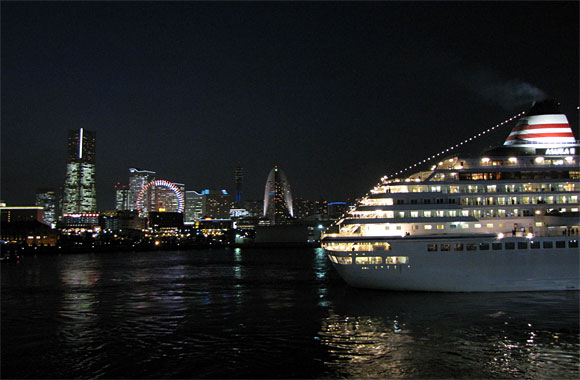 横浜港大さん橋国際客船ターミナルに停泊していた。夕暮れとともに出港する。夕陽が当たり明るく照らされたいたのが、次第に周囲が暗くなる。それと同時に船の灯りもともされていった。離岸の時刻になり静かに横浜港を去っていく。横浜みなとみらい21のイルミネーションが去りゆく飛鳥Uへの別れを告げているようだ。