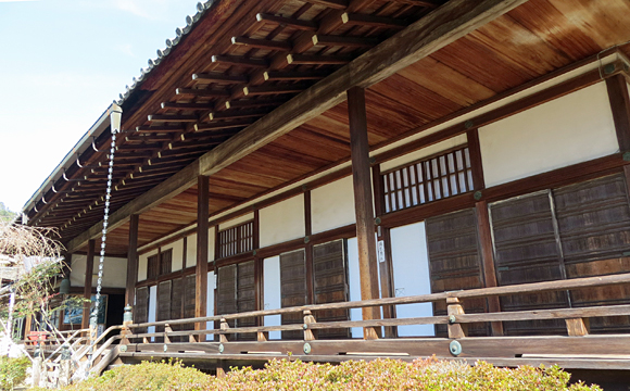 正面の本堂に本尊の毘沙門天が祀られている。左奥の宸殿は後西天皇の旧殿を賜ったもので、狩野益信の筆による、見る角度によって目や顔の向きが変わる「天井の龍」や、逆遠近法で描かれた「九老之図」などの襖絵が有名である。その奥には晩翠園と名付けられた池泉回遊式庭園がある。 |