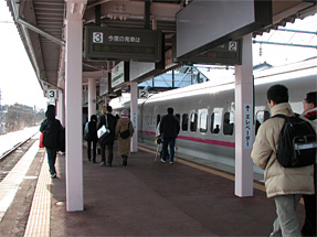 元旦、秋田新幹線「こまち」で角館駅に降りる。駅前には「あけましておめでとうございます」の横断幕をもって歓迎。みちのくの小京都・雪の似合う角館を期待していたのだが、雪は少なかった。駅前右手にある観光情報センター(白壁の建物)で地酒の利き酒(試飲)がありしばし味わう。