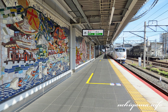 関空特急「はるか」の発着するホーム。ホームの壁面には、京都の情景を描いた半立体的装飾画がある。海外からの観光客向けだろうが、殺風景な壁面より「はるか」にいいです。列車名は「はるか」です。