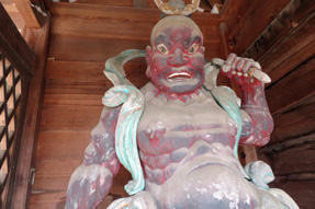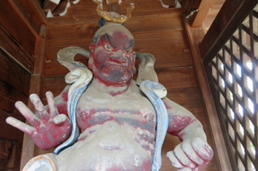 東福寺山門に立つ金剛力士像は、江戸時代の安永8年(1779) 開眼で、松材、寄木造り、玉眼水晶製嵌入の筋骨隆たる像である。通称「仁王」とも言われ、寺を守護する役目を果たしている。山門右側の阿形は口を開け、左手に独鈷杵を持ち、左側の吽形は口を閉じて立っている。 |